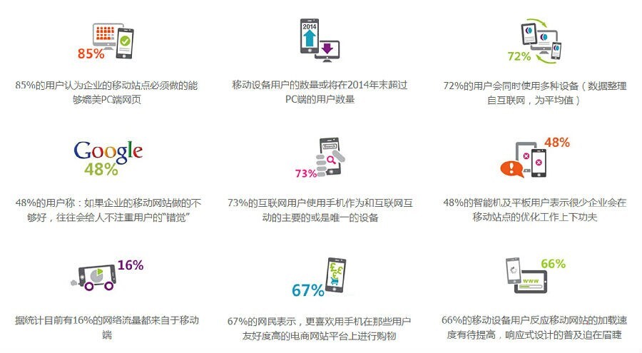 在 谷歌公司于2012年中期指出,响应式设计是优化移动网站的最佳方式之后,这种设计做法的地位得到了进一步巩固。随着iPhone、iPad和 Android手机的普及,网站主办方发现,网站在移动端应当带来与桌面端类似的体验。否则,网站在移动设备上看起来就只有细小的文字和链接,网页布局也 会一团糟。这就意味着损失流量和销售额的风险。如果你还对网站是否需要实现响应式设计存在质疑的话,看看下面的网络调查数据,相信你会更加认可网站实现响 应式布局的重要性。