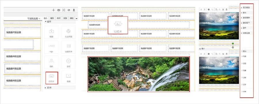 网站功能可随意添加与设置;网页所有元素都能自由拖拽,并可设置四种状态(默认、鼠标悬停、鼠标点击、选中)的全部样式(布局、定位、背景、边框、段落、文字、链接等)。