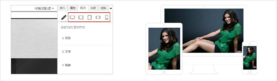 网页所有元素,均可设置五种屏幕(电脑宽屏、平板横屏、平板竖屏、手机横屏、手机竖屏)的适配样式。所有图片自动生成三个尺寸,根据屏幕大小获取最适合的一张图片,满足了各种屏幕设备的清晰显示及快速打开。