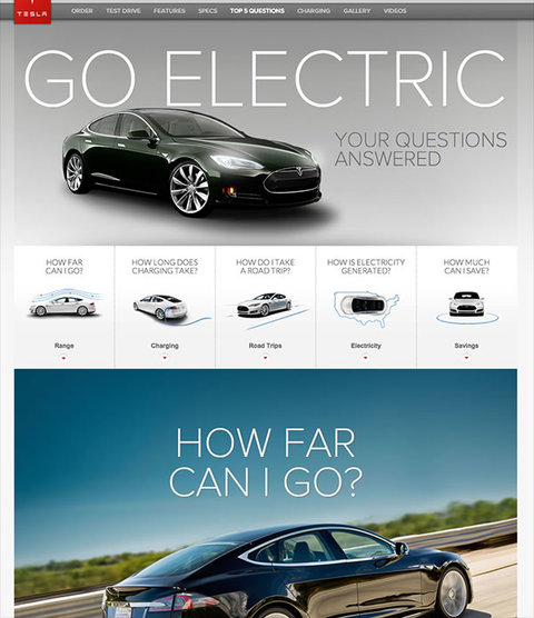 你想把所有的内容聚在一起吗?当然,不是每个页面都适合讲一个仙女的故事的。如果你的品牌由一系列概念或价值(优雅、创造力,简约等),从页面布局到字体选择,你都能通过页面元素和交互性故事来阐述品牌和理念,如特斯拉的官网。